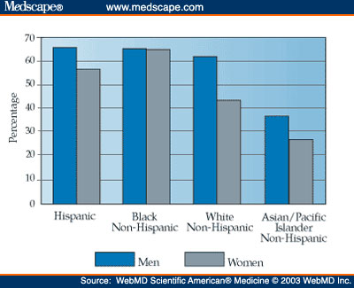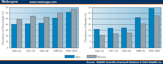 From the same reference: "In the most recently published United States data (1999 to 2000), which use the WHO criteria for overweight (BMI >/= 25 kg/m2) and obesity (>/= 30 kg/m2), 67% of men and 62% of women are overweight, and 27.5% of men and 34% of women are obese. [Note: these figures are misleading, perhaps intentionally so, because the obese are counted twice: as obese and again as overweight. Worse, these "definitions" are quite different than the ones listed in the "definition" table above, since in the table overweight is defined as 25 - 29.9, i.e. having an upper cutoff, while the contradictory definition BMI >/= 25 has no upper cutoff, so would include the obese, as well. Thus, with various mathematically-conflicting "definitions" used for overweight and obese, there is no way to comprehend what is being stated. - ljf]